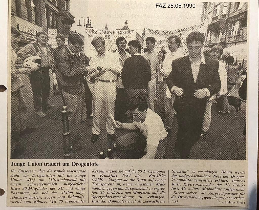 Jürgen Aha, damals Stellvertretender Vorsitzender der Jungen Union Frankfurt, prangert seit den 90er Jahren die unhaltbaren Zustände im Bahnhofsviertel an. Damals bei einer Mahnwache anlässlich von bereits 80 Drogentoten im Jahr 1990.